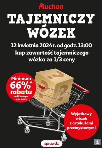 W ogólnopolskiej akcji Auchan 12 kwietnia, o godzinie 13:00, w centralnej alei każdego z 70 hipermarketów sieci zostaną umieszczone Tajemnicze wózki. Znajdą się w nich różnorodne artykuły przemysłowe, takie jak produkty małego AGD, dekoracje i tekstylia domowe, artykuły ogrodnicze, zabawki, sprzęt sportowy, produkty do majsterkowania i wiele innych. Zawartość wózków jest niespodzianką dla klientów, a ich wartość wynosi odpowiednio 300 zł, 400 zł i 500 zł. Każdy z nich można kupić z rabatem co najmniej 66%.