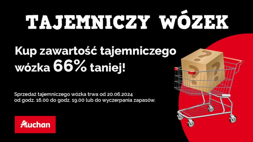 Auchan Polska rusza z trzecią już edycją entuzjastycznie przyjętej przez klientów akcji Tajemniczy Wózek. Aż 7000 koszyków niespodzianek ponownie będzie czekać na klientów we wszystkich 70 hipermarketach sieci w całej Polsce już w najbliższy czwartek, 20 czerwca br. Nowością będą koszyki tematyczne, a także nowe kategorie produktowe - kosmetyki i artykuły drogeryjne. Zróżnicowana wartość wózków tym razem będzie wynosić od 300 do nawet 1500 zł. Za każdy z nich klienci zapłacą zaledwie 1/3 ich ceny. Akcja zaplanowana jest w każdym z hipermarketów Auchan od godziny 16:00 do wyczerpania zapasów.