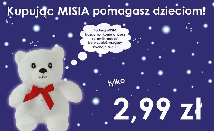 Hasłem kampanii jest: Kupując misia pomagasz dzieciom! Specjalne misie maskotki będą czekać na Klientów do 17.12.2017 Cena misia maskotki to zaledwie 2,99 zł. Zapraszamy do udziału w akcji.