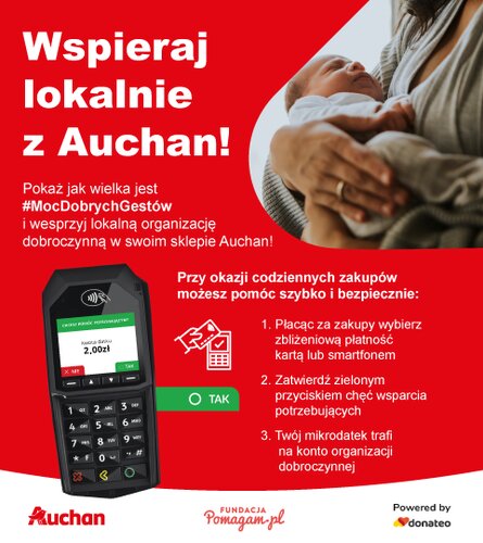 8 maja br. wystartowała ogólnopolska akcja dobroczynna na rzecz 30 fundacji i stowarzyszeń non-profit, w ramach której mikrodatki przekazane przez klientów stacjonarnych sklepów Auchan zostaną połączone ze zbiórkami na stronie Pomagam.pl. To innowacyjna w skali Polski formuła wsparcia organizacji pomocowych, której realizacja jest możliwa dzięki partnerskiemu programowi CSR Auchan, Fundacji Pomagam.pl i Donateo.