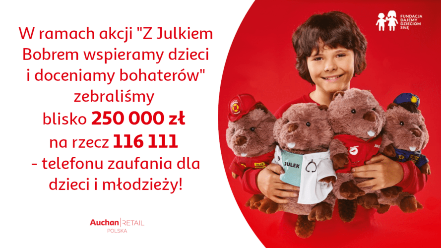 49 944 maskotek Julka Bobra sprzedanych podczas przedświątecznej akcji charytatywnej, zorganizowanej przez Auchan w grudniu 2021 r. na rzecz 116 111 – telefonu zaufania dla dzieci i młodzieży prowadzonego przez Fundację Dajemy Dzieciom Siłę przełożyło się na darowiznę w wysokości 249 720 zł.