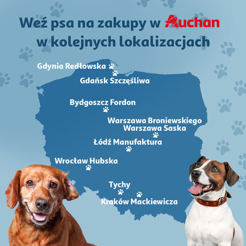 Wózki z dopuszczalną maksymalną wagą pupila 25 kg dostępne są obecnie w następujących sklepach Auchan: Tychy, Gdańsk Szczęśliwa, Łódź Manufaktura, Bydgoszcz Fordon, Warszawa Saska, Warszawa Broniewskiego, Kraków Mackiewicza, Gdynia Redłowska, Wrocław Hubska oraz w trzech hipermarketach w Poznaniu, w których akcja rozpoczęła się w czerwcu br. Wkrótce wózki pojawią się również w Auchan Wola.