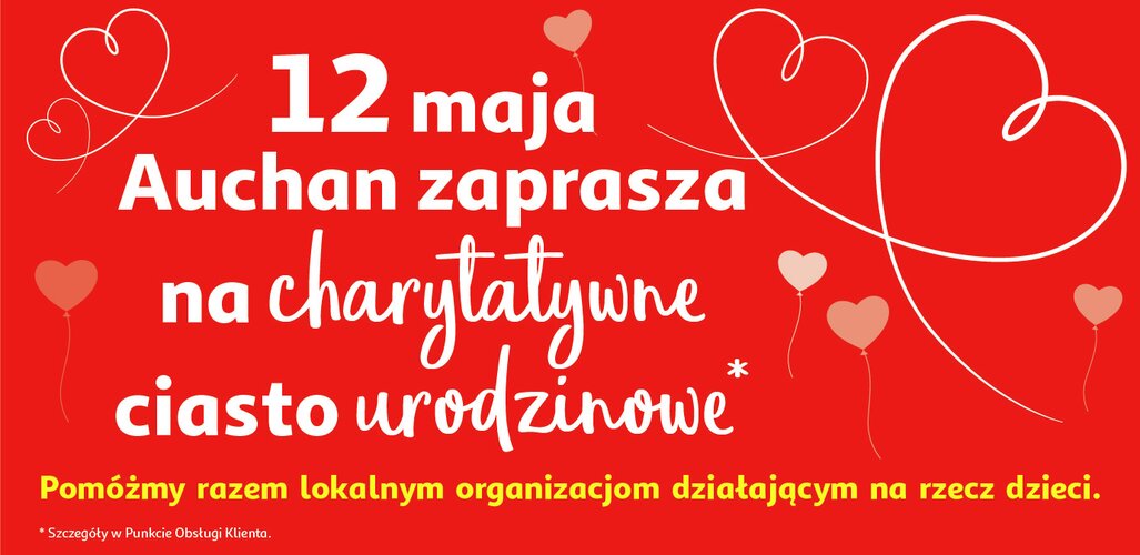 W sobotę - 12 maja - we wszystkich sklepach Auchan w całej Polsce organizowana będzie urodzinowa akcja „ciasto charytatywne”. Dochód ze sprzedaży ciasta przeznaczony jest na wsparcie lokalnych fundacji i stowarzyszeń działających na rzecz dzieci i młodych ludzi.