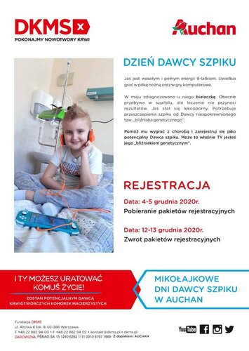W piątek i sobotę 4 i 5 grudnia, od godziny 10.00 do 18.00 w 91 sklepach: hiper- i supermarketach Auchan, pracownicy wolontariusze sieci będą rozdawać osobom chcącym się zarejestrować jako potencjalny dawca specjalne pakiety rejestracyjne. W kopertach znajdą się wytyczne, w jaki sposób można dokonać rejestracji, a także ulotka informująca o konieczności zwrotu pakietu na tym samym stoisku w dniach 12-13 grudnia. Pakiety rejestracyjne można będzie również odesłać pocztą bezpośrednio do Fundacji DKMS.