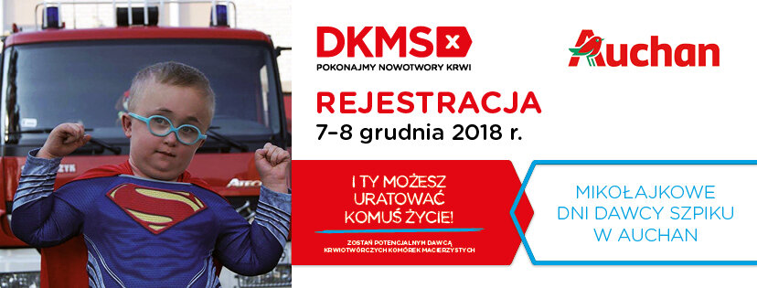 Już 7-8 grudnia, w 72 hipermarketach Auchan w całej Polsce, odbędą się akcje rejestracji potencjalnych Dawców krwiotwórczych komórek macierzystych do bazy Fundacji DKMS. Mikołajkowe Dni Dawcy Szpiku są wyjątkową okazją, ponieważ to już 13 raz Fundacja DKMS wraz z Auchan Polska łączą swoje siły zwiększając szansę na znalezienie Dawców dla każdego pacjenta potrzebującego przeszczepienia. Tegoroczne Dni Dawcy Szpiku w Auchan dedykowane są Bartusiowi i innym Pacjentom dotkniętym nowotworem krwi.