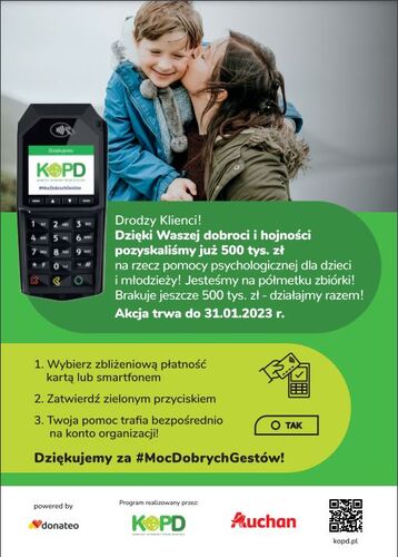 Podczas akcji na rzecz KOPD klienci hipermarketów Auchan w trakcie finalizowania transakcji bezgotówkowej mogą zdecydować się na przekazanie datku. W takiej sytuacji do rachunku doliczana jest kwota do 5 zł, która trafia bezpośrednio na konto organizacji. Klient otrzymuje niefiskalne potwierdzenie operacji, która będzie odzwierciedlona także na jego koncie bankowym.