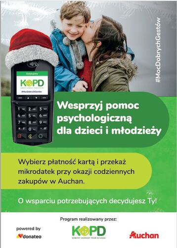 Środki zapewniające darmową pomoc psychiatryczną, terapeutyczną, prawną oraz wsparcie w zakresie mediacji rodzinnych z myślą o dzieciach i młodzieży będą zebrane przez bezgotówkowe wpłaty, pozyskiwane dzięki aplikacji Donateo. Istotą tego pomysłu jest gromadzenie datków dla fundacji drogą mikrodonacji, czyli niewielkich, ale regularnych wpłat. Podczas akcji na rzecz KOPD klienci hipermarketów Auchan w trakcie finalizowania transakcji bezgotówkowej na ekranie terminala zobaczą pytanie o chęć przekazania datku. Po potwierdzeniu do rachunku doliczona zostanie kwota do 5 zł, która trafi bezpośrednio na konto organizacji. Klient otrzyma niefiskalne potwierdzenie operacji, która będzie odzwierciedlona także na jego koncie bankowym.