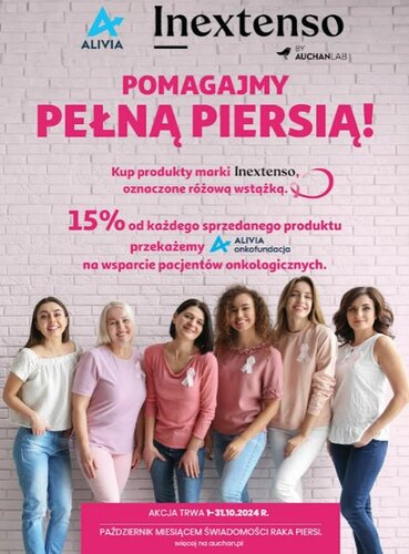 Auchan Polska już po raz kolejny w październiku dołącza do akcji Pink October i realizuje kampanię Pomagajmy pełną piersią na rzecz budowania świadomości raka piersi skierowaną do klientów i pracowników sieci. W ramach realizowanej akcji charytatywnej sprzedaż oznaczonych różową wstążką ubrań marki InExtenso Auchan wspierać będzie działania Fundacji Onkologicznej Alivia.